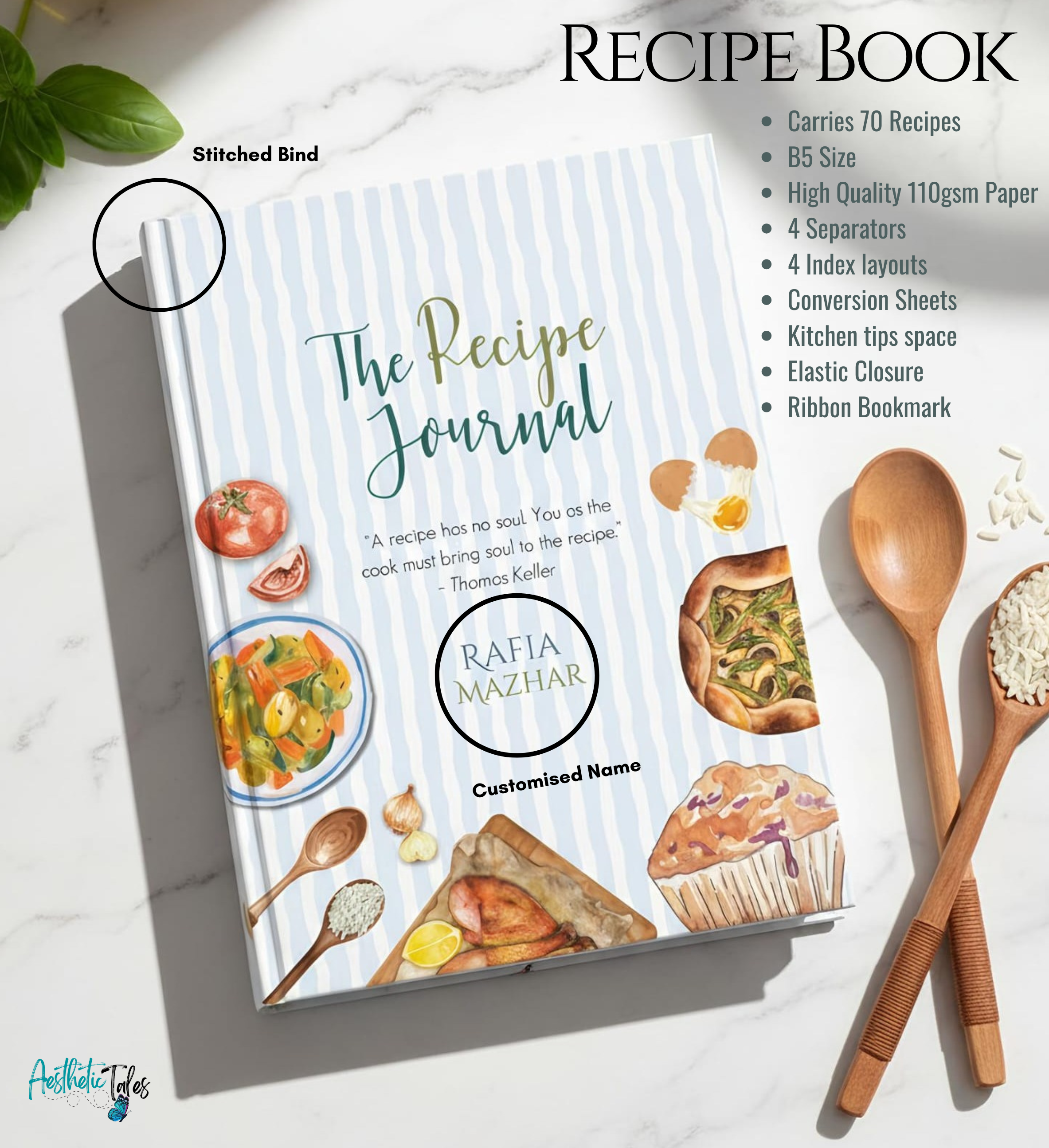 Make it uniquely yours! Add your custom name or gift it to someone special. Whether it’s Your Kitchen or Mom’s Secret Recipes, or your café name. Your personalised title makes it truly one of a kind.